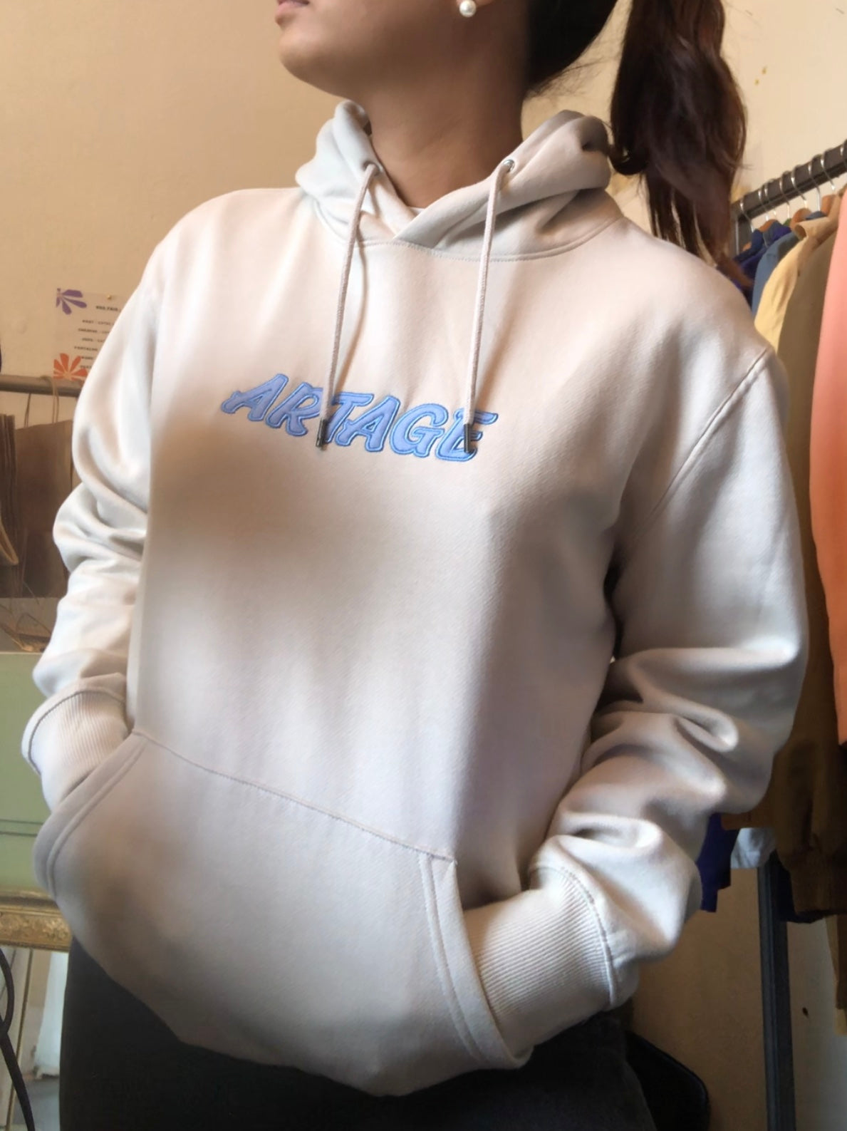 Sweat à capuche beige broderie Artage en bleu, coton BIO (oversize).